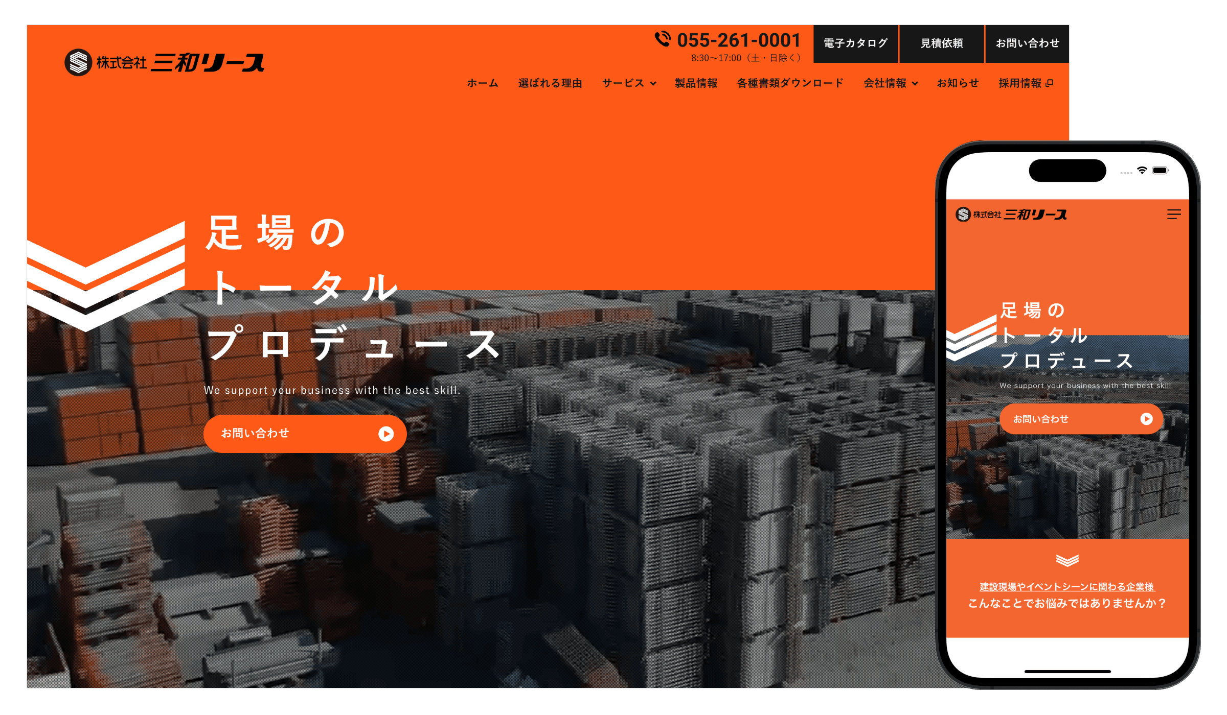 建設現場やイベント会場への仮設資材のリースや施工サービスを全国的に展開されている株式会社三和リース様のWebサイトフルリニューアルを総合広告代理店のアドブレーン社様からの受託で制作させていただきました。